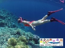 在水面穿戴救生衣,面鏡,腳蹼,呼吸管,在水面上觀賞水下景色。